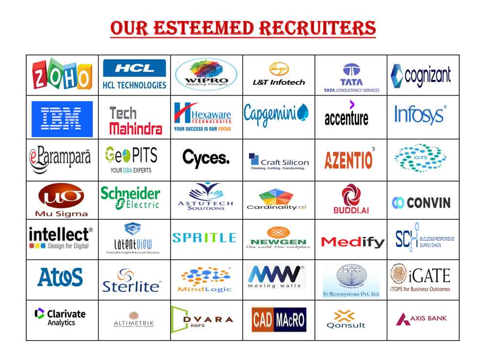 The department plays a vital role in locating job opportunities for the students who are all passing out of the department by keeping in touch with top-notch companies. The department operates throughout the year to facilitate interactions between companies and budding graduates.The illustrious alumni of the institution have extended their fullest support in the placement-related activities and roped in many companies for the campus drive, besides conducting pre-placement training programmes at frequent intervals to improve the students’ skill set.
