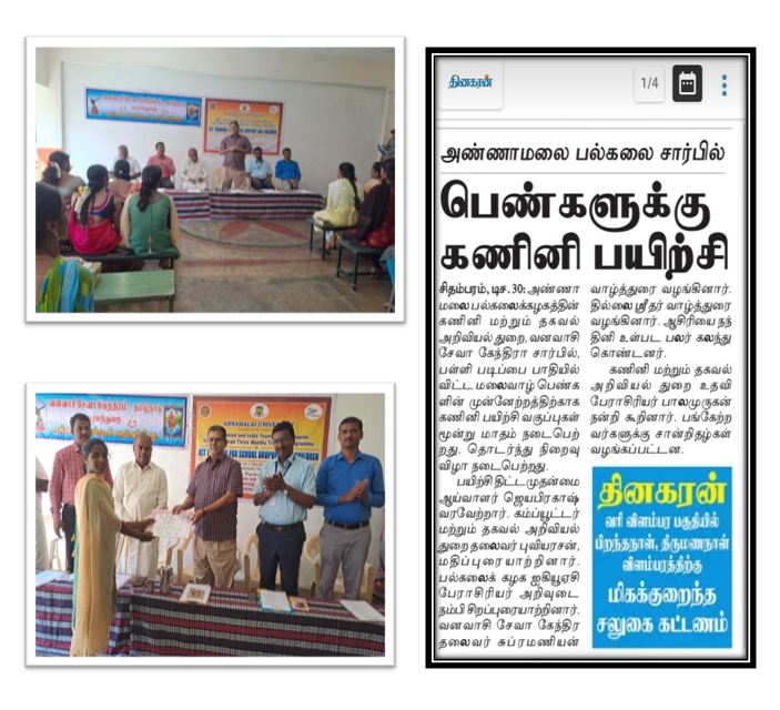 The Department of Computer and Information Science, Annamalai University conducted a three-month training program on "ICT Training for School Dropout Girl Children". The program, which was supported by the India Team - Seattle Chapter in the USA and enabled by the Internal Quality Assurance Cell (IQAC), took place from September 10, 2022, to December 28, 2022, in Karumandurai, Kalvarayan Hills, Salem District.