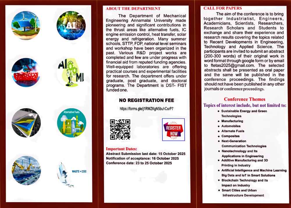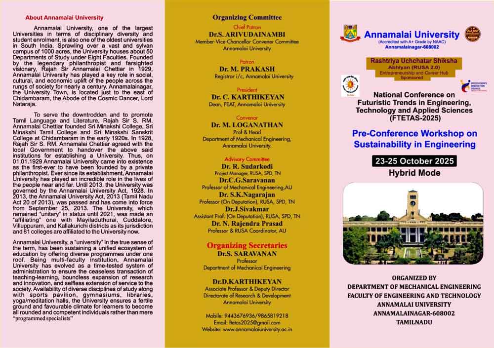 Home > Conferences/ Seminars/ Workshops > Upcoming Events > National Conference on Futuristic Trends in Engineering, Technology and Applied Sciences (FTETAS-2025) Pre-Conference Workshop on Sustainability in Engineering